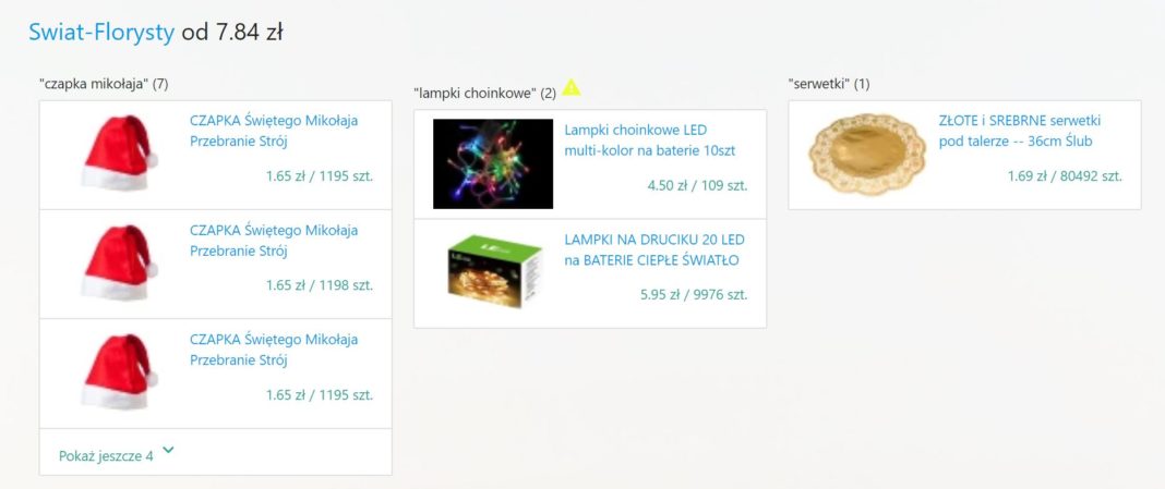 Jako drugi test przygotowałam dla aplikacji listę związaną ze świętami. Poprosiłam ją o odnalezienie czapki Mikołaja, lampek na choinkę i serwetek pod talerze. W tym przypadku strona poradziła sobie równie dobrze. Pokazała mi kilkunastu różnych sprzedawców, u których takie przedmioty mogłam kupić. Warto zaznaczyć, że strona od razu podaje nam informację o tym za jaką łączną kwotę możemy w danym sklepie je kupić.